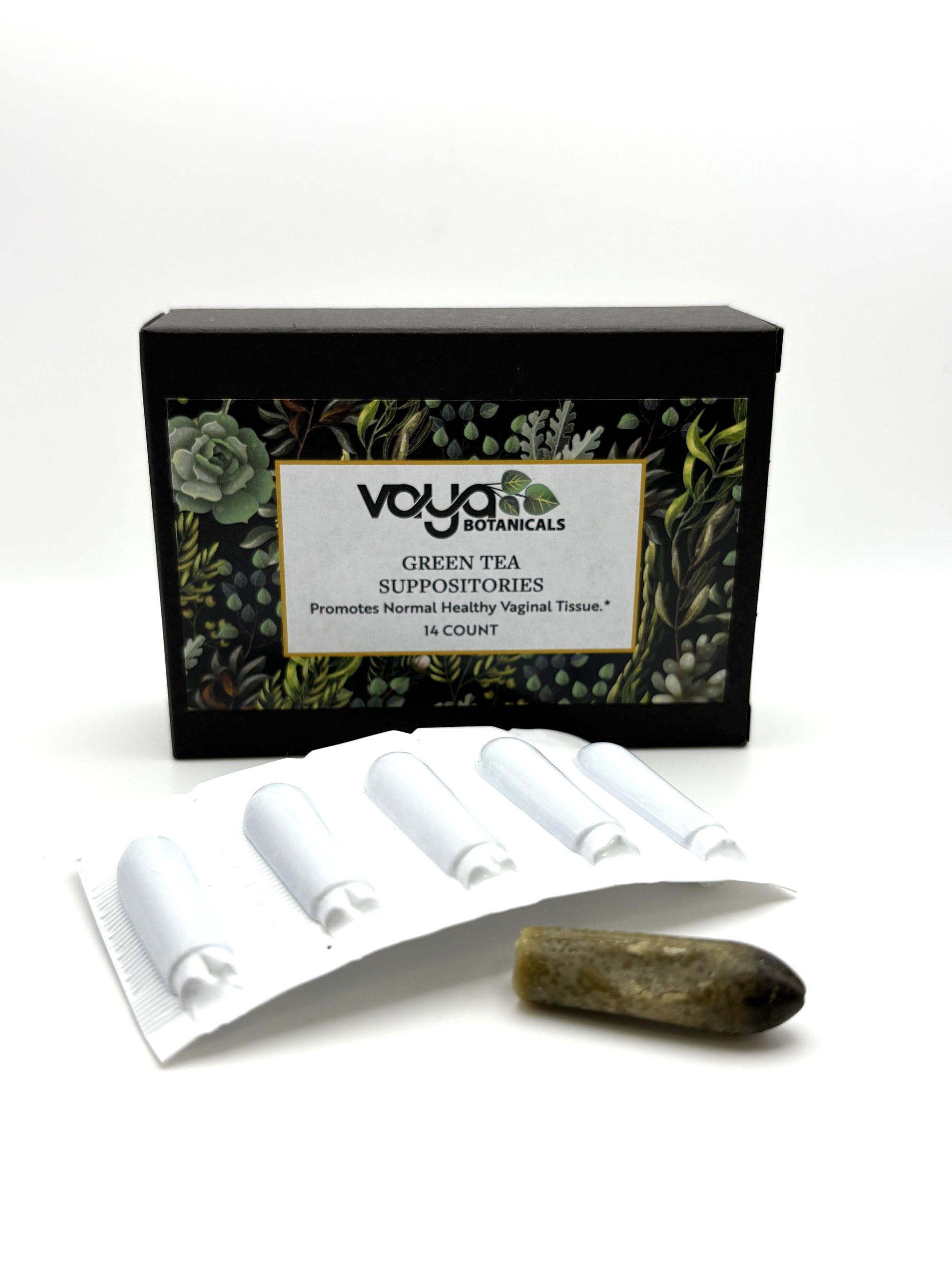 Green tea (Camellia sinensis) provides antioxidant support both vaginally or rectally. Each suppository contains approximately 250mg of green tea in a base of organic cocoa butter and vitamin E oil. Green tea contains a small amount of caffeine.